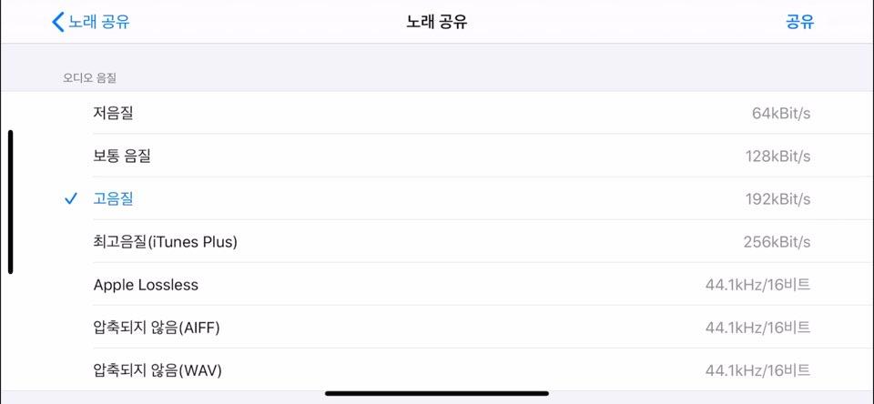 그다음 올리고 싶은 곡을 손가락으로 꾹 눌러줍니다. 그러면 다음과 같은 메뉴가 뜰 거예요. 거기서 공유를 누릅니다.