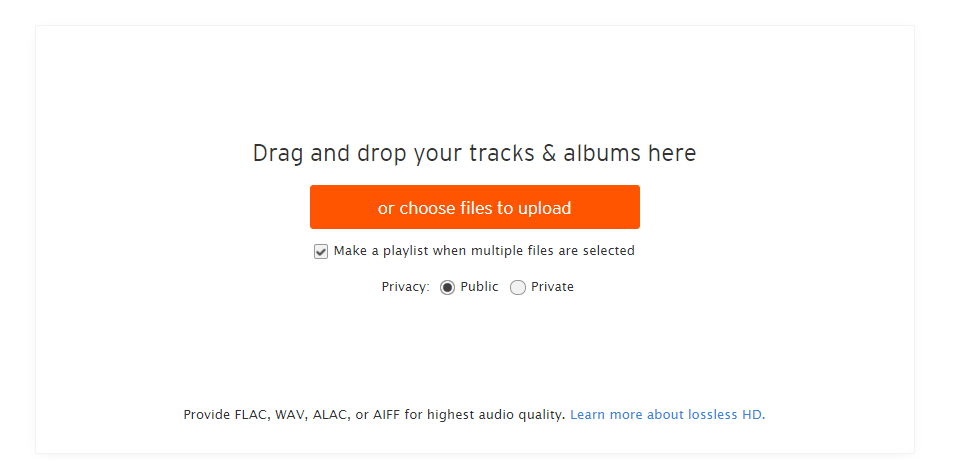 클릭하시면 바로 이런 화면이 뜰 겁니다. 파일을 드래그하거나 클릭, 지정해서 올려줍니다. Public 은 공개 Private 은 비공개입니다. 개인만 소장할 거면 비공개로 해놓으면 좋아요. 클라우드 역할을 해주니까요. 오디오 파일은 mp3, Flac, Wav, Alac혹은 AIFF 파일 다 됩니다. 아까 개러지 밴드에서 업로드 시 선택하면에 있던 파일들은 다 됩니다.